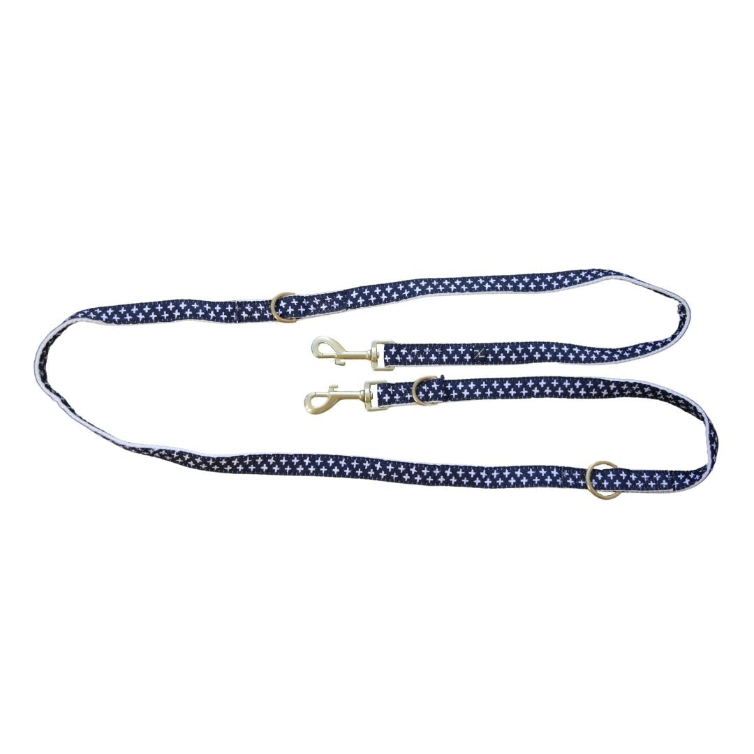Hemp Dog Lead - Multi Function with Leather & Brass Fittings - Navy Cross Print